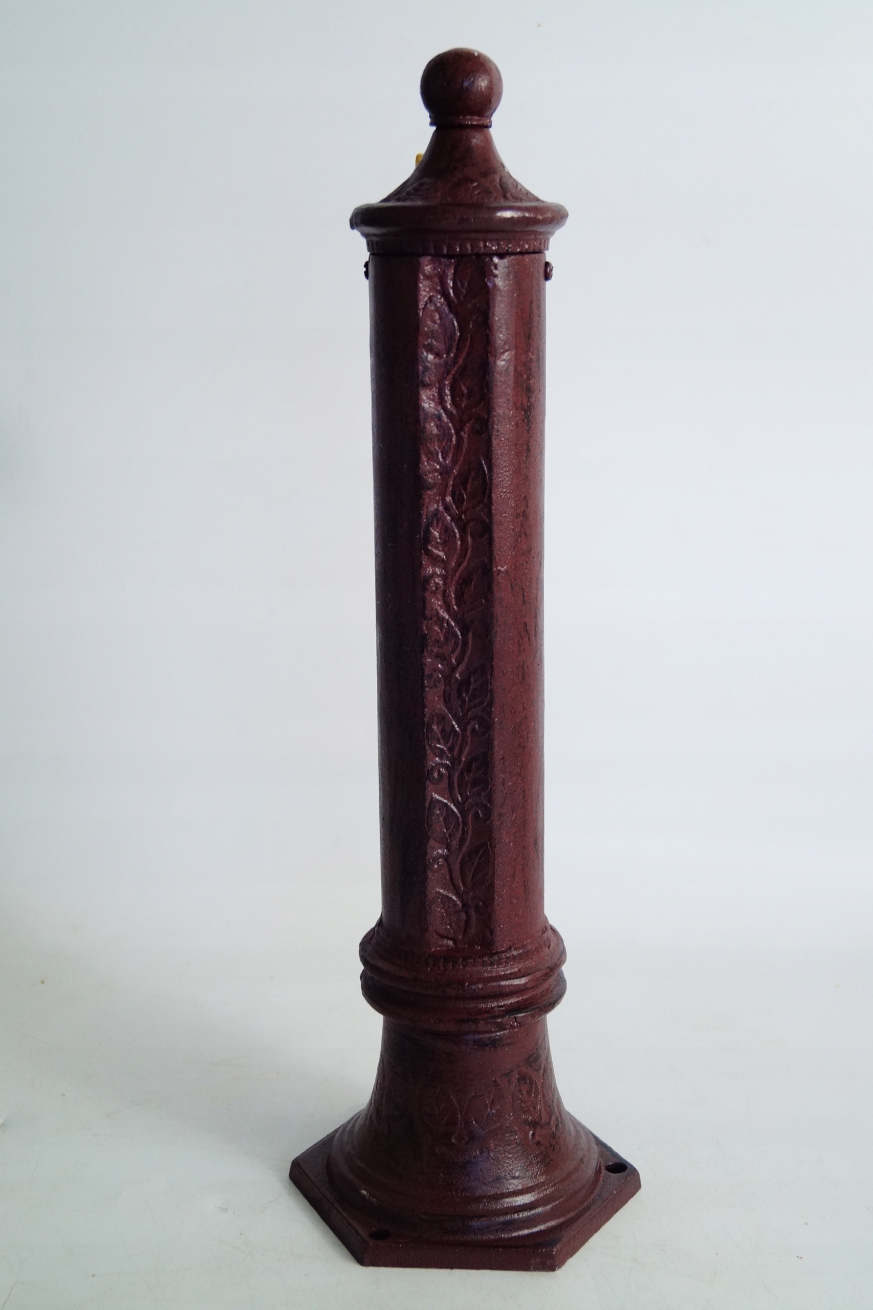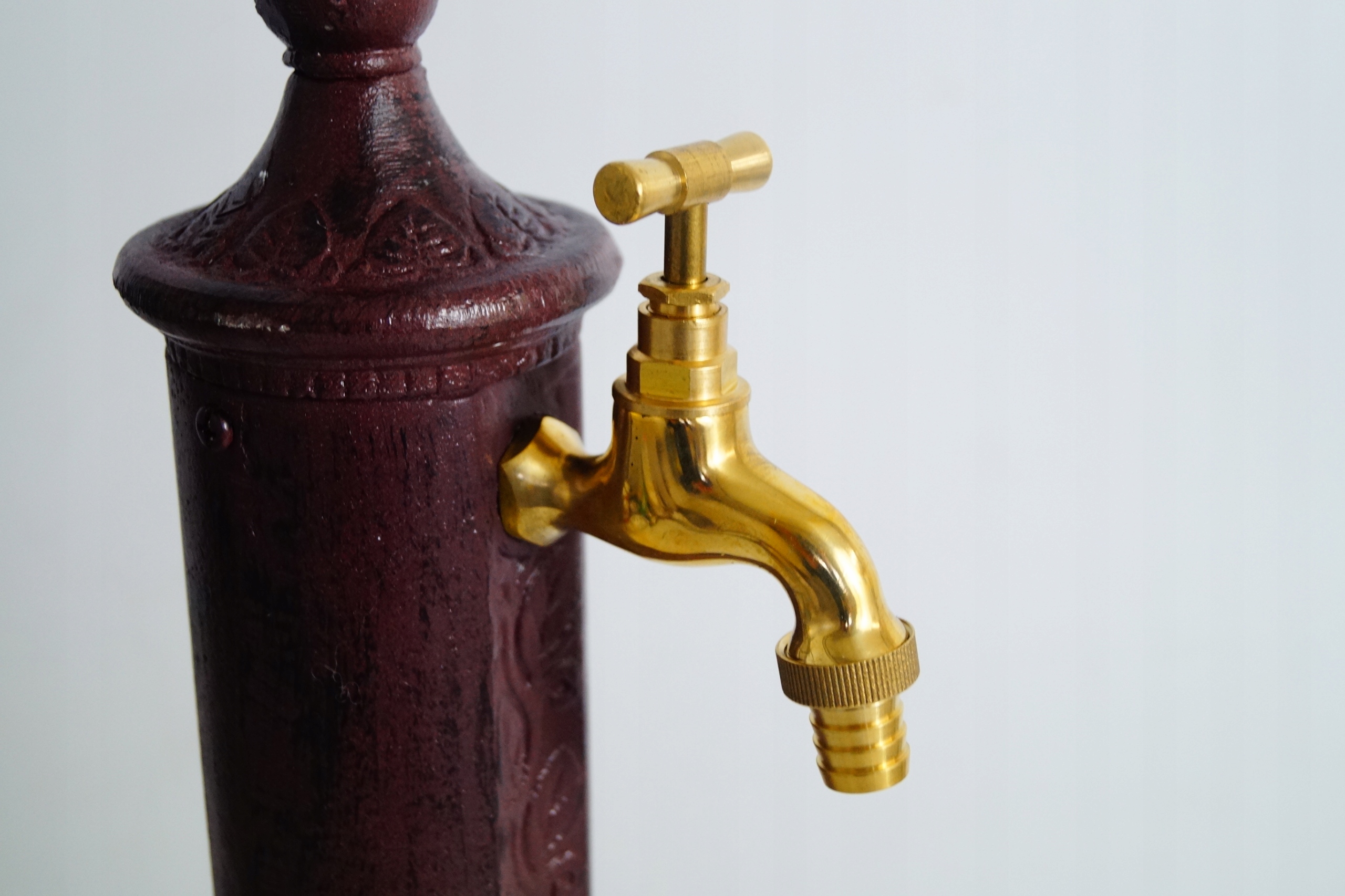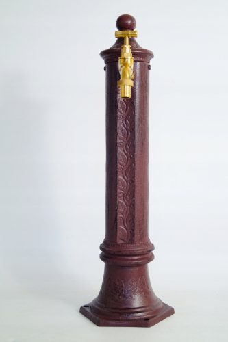 Aluminiowy stojący słupek w kolorze brązowym przypominający stary hydrant. Słupek można przymocować na podstawie z bruku lub fundamencie za pomocą trzech otworów w podstawie. W zestawie ze zlewem mosiężny dekoracyjny kran oraz łącznik 1/2 cal służący do połączenia przez prześwit w słupku z wcześniej wykonanym przyłączem. Kran przystosowany do szybkozłącza. Całość tworzy funkcjonalną dekorację Państwa ogrodu