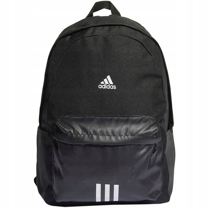Plecak adidas Classic Badge of Sport 3 stripes czarny HG0348. Plecak sportowy adidas ze względu na mnogość zastosowań spełni oczekiwania osób w różnym wieku, którym zależy na bezproblemowym przenoszeniu niezbędnych rzeczy przy zachowaniu wysokiej jakości. Poliestrowe włókna o płóciennym splocie tworzą solidną konstrukcję, która nie zawodzi zarówno na szkolnym korytarzu, jak i podczas drogi na trening. Zapinana komora główna o całkiem sporej pojemności oferuje wygodny dostęp do zawartości. Kieszeń na suwak umieszczona od przodu plecaka umożliwia organizację drobiazgów, które chcesz mieć pod ręką w każdej sytuacji. Boczne kieszonki to doskonałe miejsce na bidon z wodą, energetyczne przekąski lub mokry ręcznik po treningu. O uczucie komfortu podczas noszenia dbają profilowane, wyściełane szelki z regulacją, których długość z łatwością dopasujesz do swojej sylwetki. Mocna, pleciona rączka pozwala na pewny chwyt w dłoni lub zawieszenie plecaka na haczyku. Czarny model z białymi paskami na przodzie i subtelnym logo prezentuje sportowy styl w ponadczasowym wydaniu. Plecak szkolny adidas oferuje wygodne korzystanie z podręcznego ekwipunku na co dzień. Wybierając model wykonany częściowo z poliestru pochodzącego z recyklingu, wspierasz naturalne środowisko i jego zasoby oraz zmniejszasz emisję szkodliwych substancji.