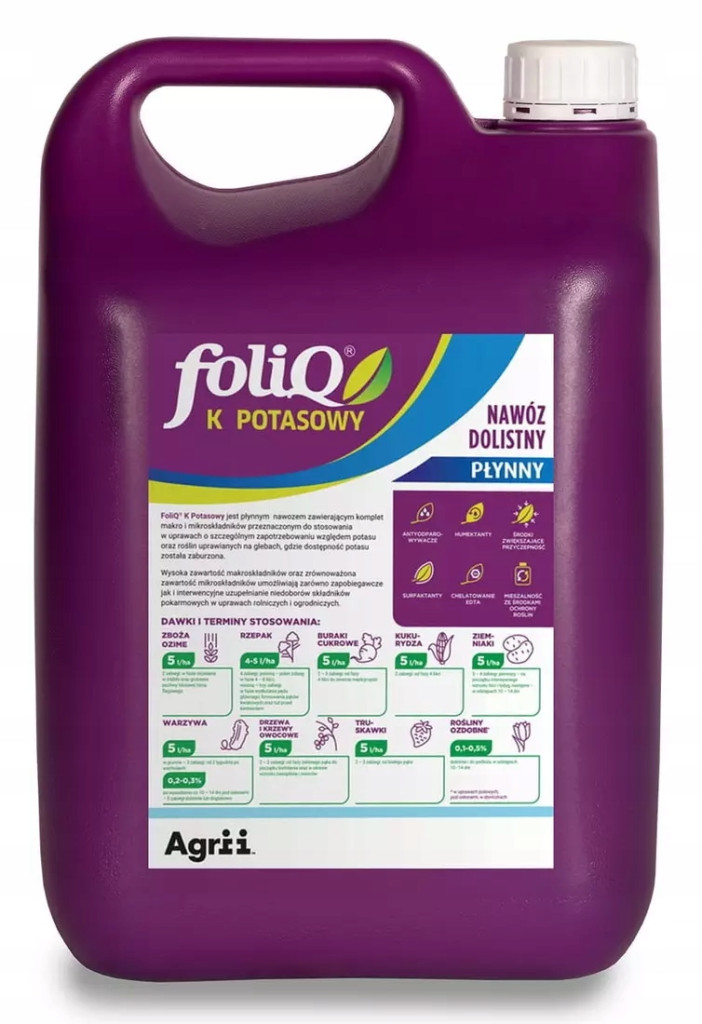 Foliq K 5L AGRII - uniwersalny, dolistny, do uzupełniania prewencyjnego oraz interwencyjnego, uzupełnianie widocznych i ukrytych braków potasu. stosowany w uprawach: rzepak, zboże ozime, burak cukrowy, kukurydza, ziemniak, warzywa, drzewa i krzewy owocowe, truskawka, rośliny ozdobne.