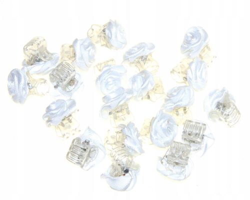 Bezbojne ukosnice s bijelom ružom za manžete Lucy, komplet od 20 komada za pričest i vjenčanje. Svaka ukosnica ima satensku ružicu dimenzija 1 cm x 1 cm, s promjerom ružice od otprilike 1,5 cm. Ovaj s