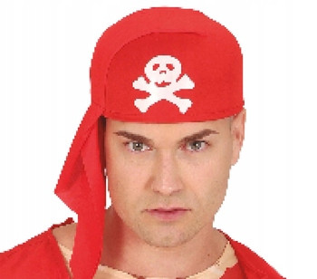 Filcowy kapelusz, z przymocowaną na stałe bandaną w czerwonym kolorze. Na froncie nadruk białej czaszki i skrzyżowanych kości. Z boku zwisa część materiału, która imituję wiązanie chusty. Niezbędny dodatek do kostiumu korsarza czy pirata - pogromcy mórz i oceanów.
