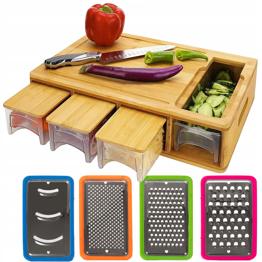 Deska posiada 4 szufladki w której mieszczą się pojemniki z pokrywkami. Pojemnik służy do zbierania ścieranych składników i umożliwia ich przechowywanie bezpośrednio po starciu. Jest to bardzo wygodne oraz oszczędza Twój czas. W zestawie są 4 pojemniki jednakowej wielkości, które możesz poukładać jeden na drugim i zaoszczędzić miejsce np. w lodówce