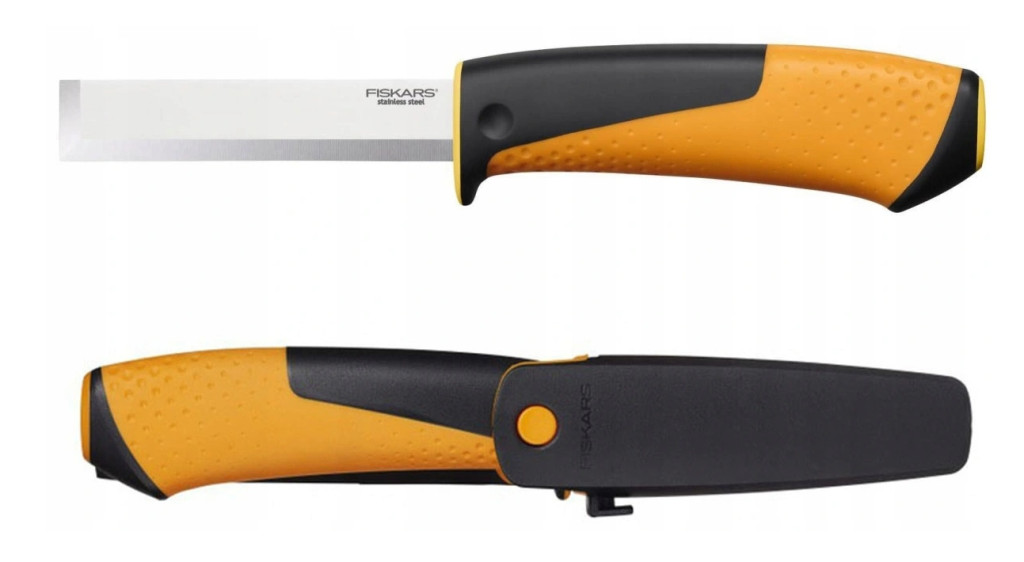 Nóż stolarski Hardware Fiskars. Nóż z masywnym ostrzem przeznaczony do prac stolarskich z serii Hardware marki Fiskars. Posiada dwie naostrzone powierzchnie umożliwiające cięcie. Pierwsza, podłużna powierzchnia może być wykorzystywany jako klasyczny nóż. Druga, poprzeczna pozwala na wykorzystanie noża w charakterze dłuta.