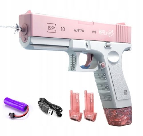 Elektryczny pistolet na wodę strzela wodą pod wysokim ciśnieniem . Idealny podczas zabaw, Śmingusa Dyngusa, dla ochłody w gorące dni.