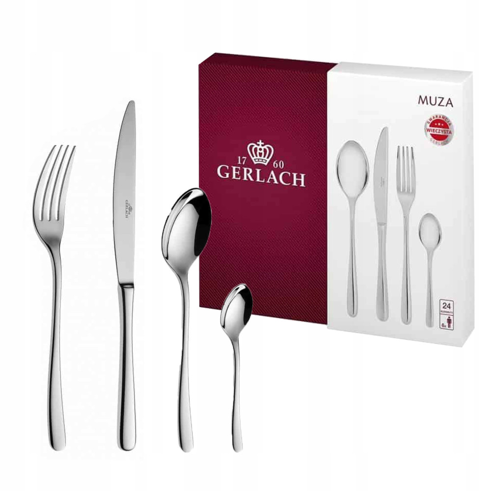 Komplet sztućców z serii Muza znanej i cenionej firmy Gerlach to idealne wyposażenie dla każdej jadalni. Składa się z 24 sztuk sztućców takich jak łyżka obiadowa, widelec obiadowy, nóż obiadowy oraz łyżeczka do herbaty. Zestaw przeznaczony jest dla sześciu osób, a dzięki wykonaniu z wysokiej jakości stali nierdzewnej jest wytrzymały i bardzo elegancko prezentuje się wizualnie. Czyszczenie sztućców jest bardzo proste dzięki możliwości mycia w zmywarce, a ich przechowywanie ułatwia eleganckie opakowanie.
