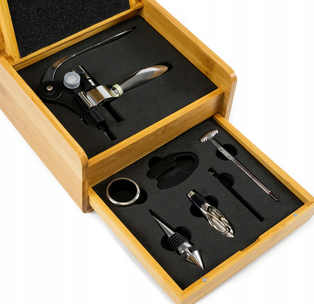 Wszystkie akcesoria zostały umieszczone w bambusowej skrzyneczce z szufladką o niezwykle oryginalnym designie, w grubej, twardej gąbce, dzięki czemu całość prezentuje się niezwykle elegancko.