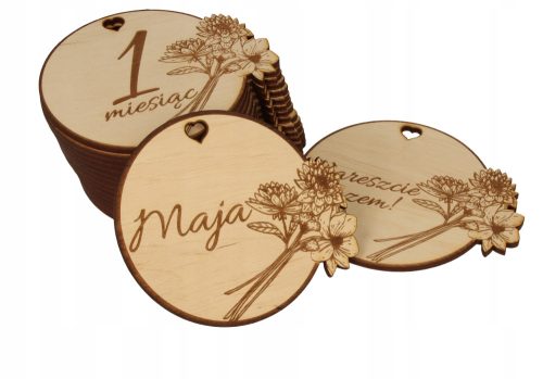Komplet drewnianych tabliczek do zdjęć dokumentujących pierwsze 12 miesięcy życia.