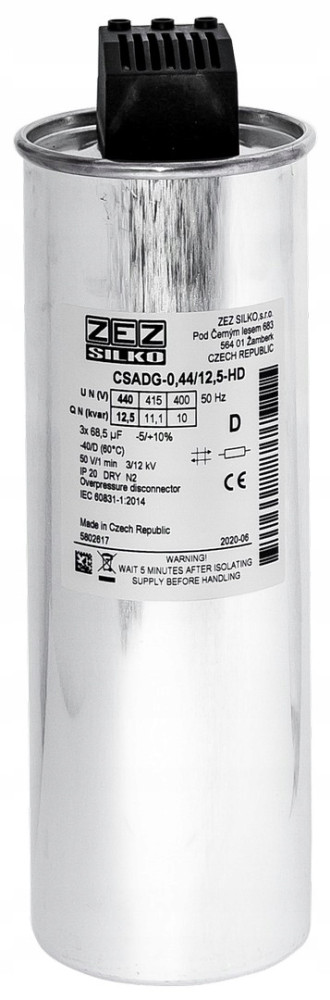 Kondenzator za kompenzaciju jalove snage od 12.5 kVar pri naponu od 440 V, namijenjen za povećanje učinkovitosti električnih sustava. Ovaj kondenzator ima pojačanu sposobnost kompenzacije jalove snage, što rezultira smanjenjem gubitaka energije i poboljšanjem ukupne učinkovitosti sustava. Sa svojim dimenzijama od 85 x 245/296 mm i strukturom u trójkutu, ovaj kondenzator je idealan za unutarnju uporabu. Opremljen je metaliziranom folijom od polipropilena, što osigurava visoku razinu izolacije i pouzdanost. Također, ovaj kondenzator zadovoljava sve relevantne standarde kvalitete i sigurnosti, uključujući IEC EN 60831-1, IEC EN 60831-2, UL No. 810 i GOST 1282-8. S maksimalnom wilgotnošću od 95% i očekivanom životnošću od preko 130,000 sati, ovaj kondenzator pruža pouzdanu i dugotrajnu uslugu za vaše električne potrebe.