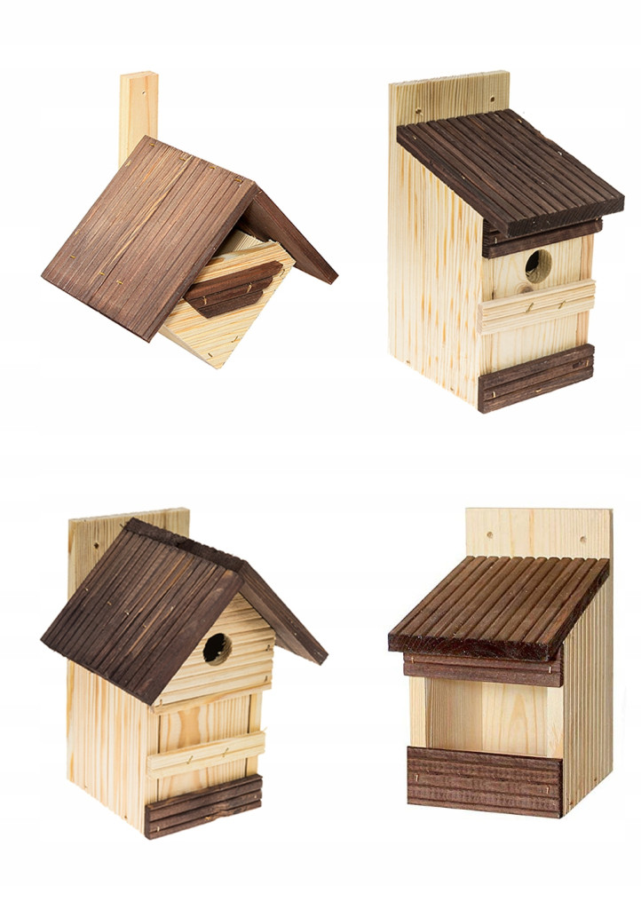 Piękne, drewniane budki dla ptaków. Stworzone z drewna sosnowego. Zabezpieczona impregnatem w kolorze naturalnym i palisander. Wydłużony dach chroni przed deszczem i śniegiem. Budka lęgowa będzie doskonała dla takich ptaków, jak: sikorka bogatka, sikorka czubatka, sikorka modraszka, sikorka sosnówka, mazurek, muchołówka żałobna, pleszka czy wróbel domowy, kos i kopciuszek.