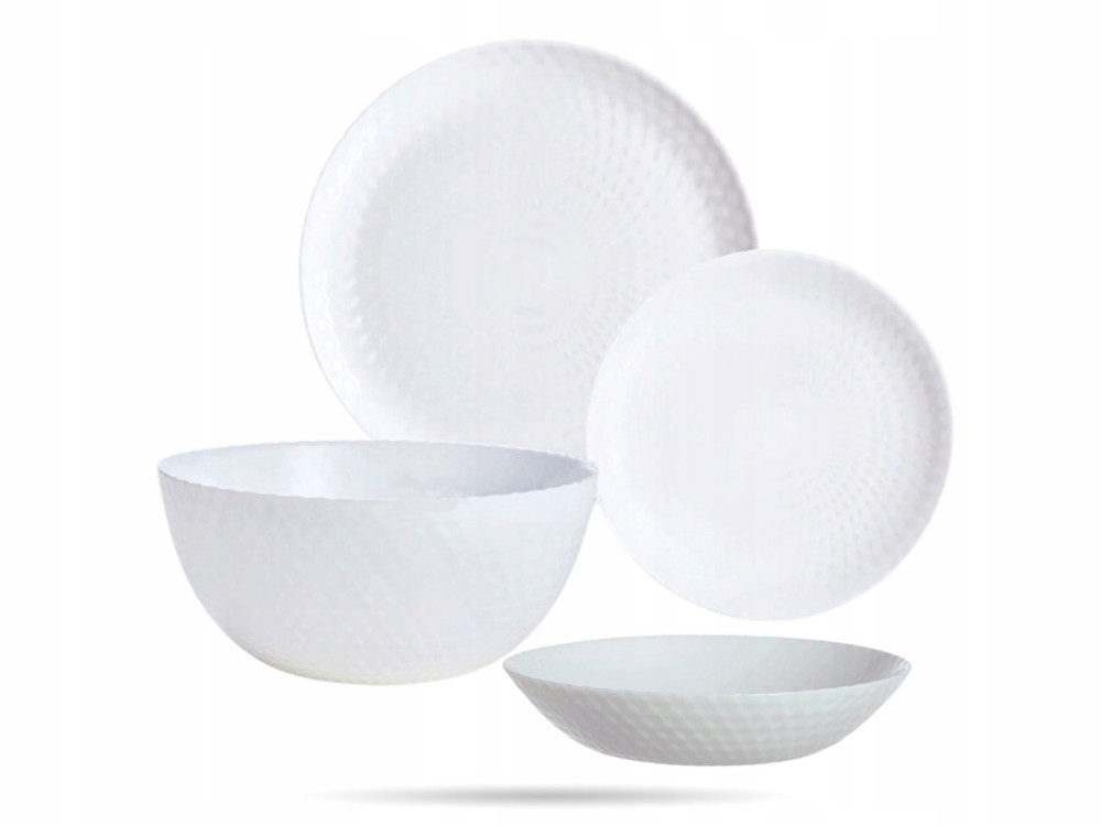 Serwis obiadowy Pampille Luminarc. Komplet naczyń dla 6 osób - talerze obiadowe, płytkie i głębokie, talerze deserowe i duża salaterka. Pampille Luminarc to seria zdobiona wypukłym, geometrycznym wzorem, występuje w kilku wersjach kolorystycznych. Mocne i lekkie naczynia ze szkła hartowanego - można myć w zmywarce.