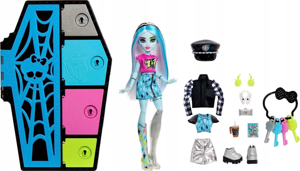 A gdy tylko zabawa się zakończy, posłuży im jako schowek na lalkę Frankie Stein, opatrunki i akcesoria Frankie Stein elektryzuje modnymi knotami i sukienkami, które celebrują jej pochodzenie i które dzieci będą czerpać przyjemność z łączenia i dopasowywania