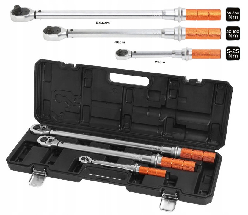 Zestaw kluczy dynamometrycznych 1/4", 3/8", 1/2" 3 szt. 08-843 marki NEO to kompleksowe zestawienie trwałych kluczy o zakresie działania: ¼” 5-25 Nm i długości 25 cm, ½” 65-350 Nm i długości 54,5 cm oraz 3/8” 20-100 Nm i długości 46 cm. Narzędzia charakteryzują się metalową konstrukcją oraz wzmocnieniem z rury ze stali stopowej. Część robocza kluczy została wykonana z wysokiej jakości stali CrV. Ich dokładność utrzymuje się na poziomie +/-4% od 20% do 100% maksymalnego momentu obrotowego, a mechanizm blokujący push-pull pozwala zachować większą precyzję w trakcie pracy. Kluczy nie należy przechowywać ze sprężyną ustawioną na maksymalne wartości. Doskonałe parametry potwierdzają certyfikaty kalibracji i TÜV M+T. Zestaw dopełnia etui z tworzywa.