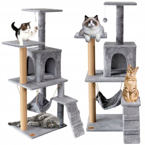 Stwórz swojemu kotu miejsce, które spełni wszystkie jego potrzeby - od zabawy, poprzez odpoczynek, aż po drapanie. Nasz wielopoziomowy drapak to solidna konstrukcja z trwałych materiałów, zaprojektowana z myślą o naturalnych instynktach i rozrywce Twojego futrzanego przyjaciela. Drapak wyposażony jest w miękkie platformy, zaciszne kryjówki, obserwacyjny płaski taras na szczycie oraz relaksujący hamak. Dzięki specjalnym słupkom do drapania, Twoje meble będą chronione przed uszkodzeniami. Całość pokryta jest przyjemnym w dotyku materiałem, który zapewnia komfort i ciepło.