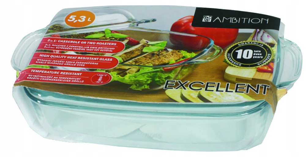 Marka Ambition to synonim piękna i elegancji. Niebanalne, zawsze podążające za duchem czasów wzornictwo i naprawdę duży wybór to nasze najmocniejsze strony. Wśród naszych produktów można znaleźć to, co niezbędne w każdym domu - wysublimowaną zastawę stołową, różnego rodzaju naczynia, sztućce, garnki, czajniki, patelnie oraz wszelkie inne akcesoria kuchenne. Szeroki wybór naszych produktów sprawia, że każdy znajdzie tu coś dla siebie.Naczynie żaroodporne z pokrywą przeznaczone jest do pieczenia we wszystkich typach piekarników, podgrzewania potraw w kuchence mikrofalowej, a także przechowywania żywności w zamrażalniku i lodówce. Wytrzymuje temperatury od -40 do +300°C. Można myć w zmywarce. Naczynie o podwójnej funkcjonalności: może być używane jako naczynie z pokrywą lub służyć jako 2 osobne brytfanny.Zalecenia do użytkowania: w trakcie pieczenia cała powierzchnia naczynia powinna być pokryta warstwą roztopionego tłuszczu lub cieczy. Nie należy podgrzewać pustego naczynia, dolewać zimnych płynów do rozgrzanego naczynia oraz stawiać gorącego naczynia na zimnym lub mokrym podłożu. Naczynie należy wyjmować z piekarnika lub kuchenki mikrofalowej w rękawicach kuchennych lub chwytając przez suchą ściereczkę. Do czyszczenia nie stosować środków ściernych, substancji żrących, ostrych gąbek i druciaków mogących porysować powierzchnię naczynia.