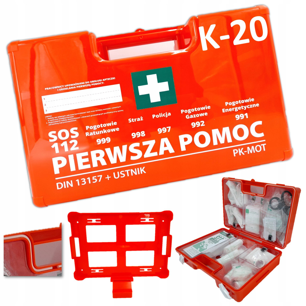 Aukcja dotyczy apteczki firmy PKMOT model K – 20. Jest to apteczka wykonana z wysokiej jakości tworzywa sztucznego. Posiada zarówno uchwyt do montowania na ścianę jak i rączkę do swobodnego przenoszenia w dowolne miejsce.