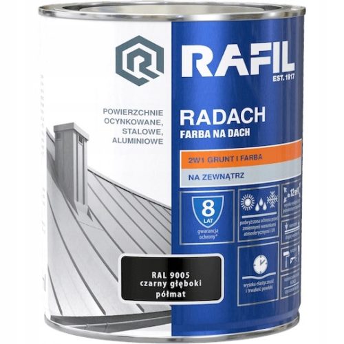 RAFIL RADACH FARBA NA DACH Profesjonalna farba do malowania dachów, rynien i parapetów. Produkt 2 w 1: grunt + farba. Zapewnia podwyższoną ochronę przed działaniem zmiennych warunków atmosferycznych i promieniowaniem UV. Tworzy trwałą, wysoce elastyczną powłokę. Może być stosowana do zewnętrznych powierzchni stalowych, ocynkowanych i aluminiowych, zarówno przy wykonywaniu nowych wymalowań, jak i renowacji starych powłok malarskich. Farba zapewnia wysoką wydajność: do 12m2/l przy jednokrotnym malowaniu i 8 lat gwarancji ochrony.