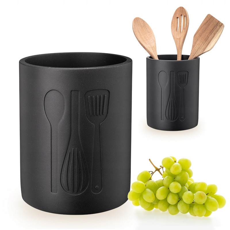 Czarny, kamienny przybornik jest również ciężki, przez co stabilnie leży na kuchennym blacie. Ciekawe tłoczenia o kształcie przyborów kuchennych dodają mu uroku.