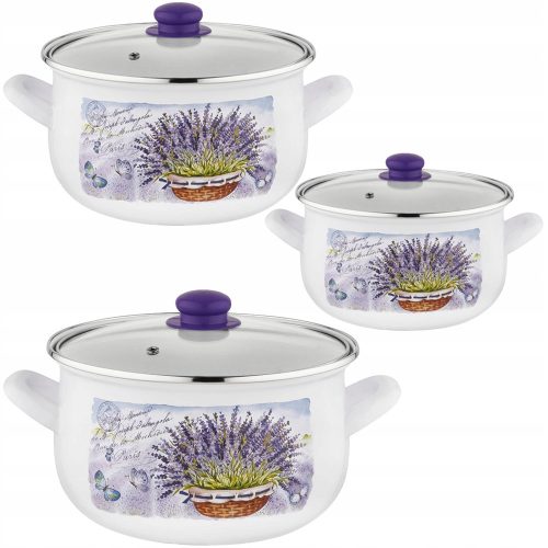 Zestaw trzech garnków emaliowanych z pokrywkami z serii Emalia Polska Pleszew Lavanda łączy funkcjonalność z eleganckim designem, zapewniając bezpieczne gotowanie dla całej rodziny.