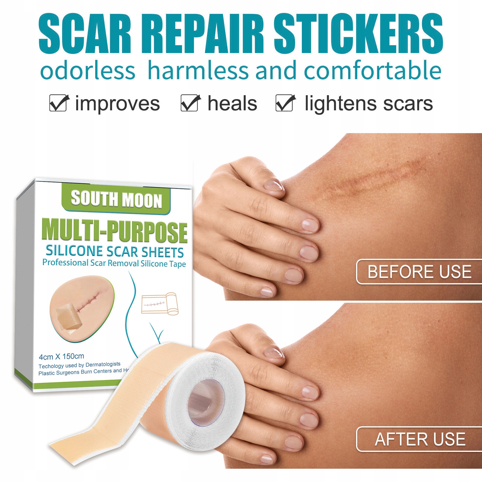 Łatwy w użyciu: Przytnij papier zgodnie z rozmiarem i kształtem blizny. Zdejmij folię ochronną z samoprzylepnej strony plastra. Przyklej samoprzylepną stronę papieru bezpośrednio na bliznę.