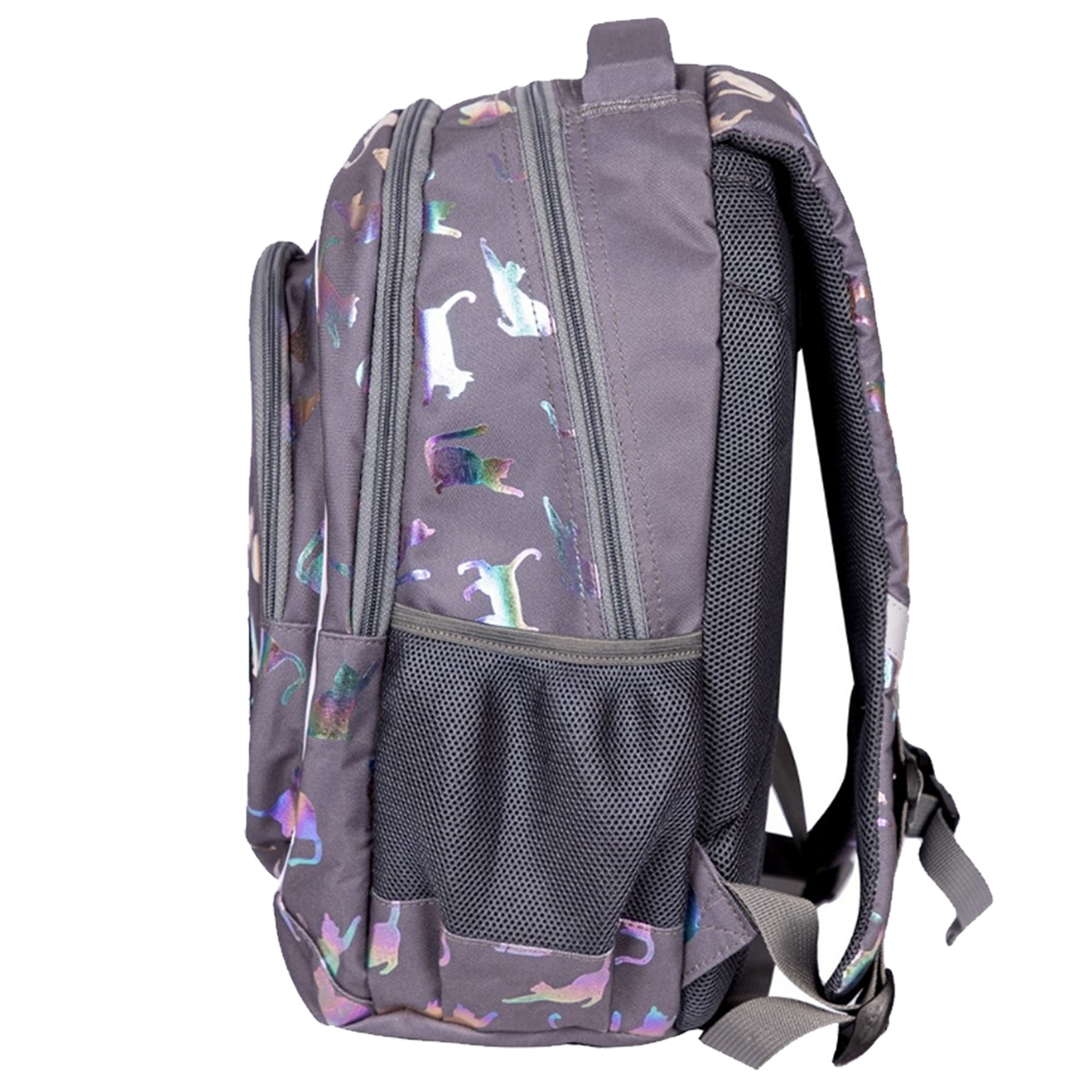 Holograficzny zadruk ombre z motywem kotów przyciąga uwagę i nadaje plecakowi wyjątkowy charakter.