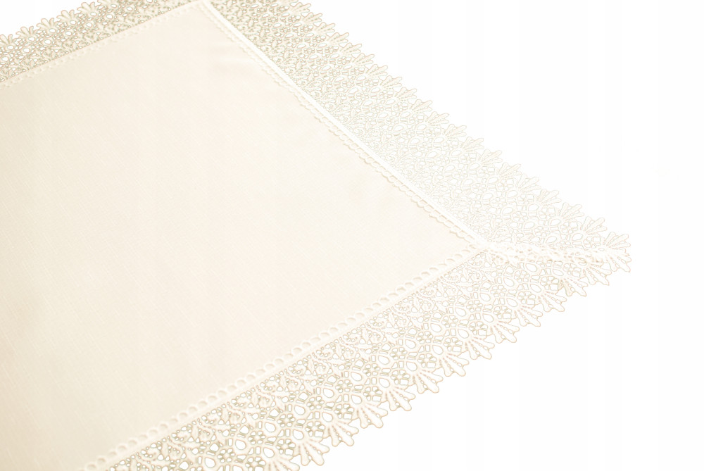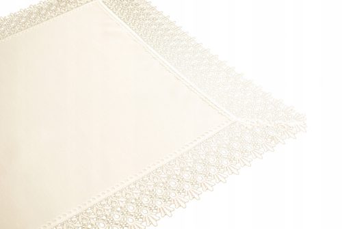 Kremowy, gładki obrus/pas stołowy w delikatne reliefy ozdobiony grubą, ciężką gipiurą. Obrus doskonale układa się na stole a delikatna tkanina pozwala dowolnie modelować bieżnik na środku.