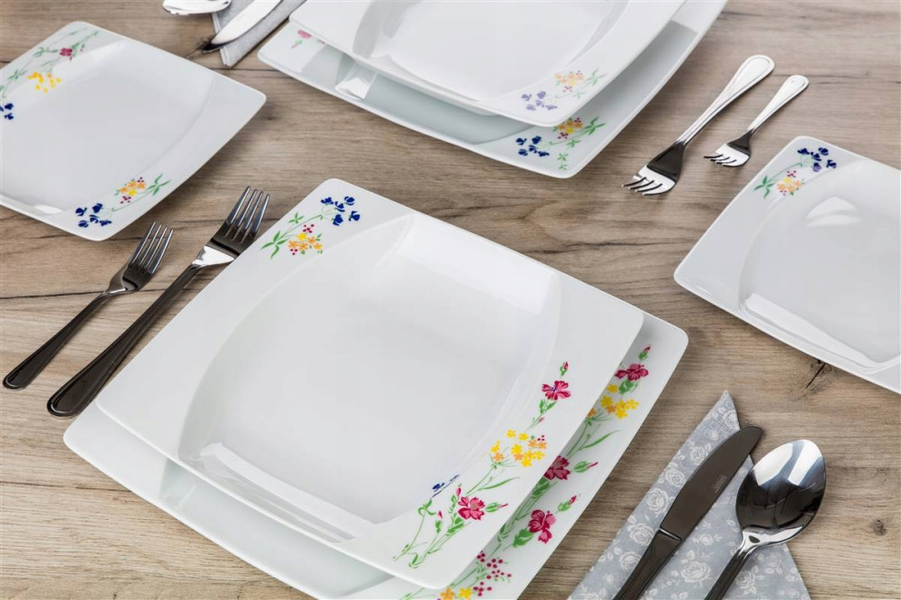 ➡️ 18-częściowy zestaw kwadratowych talerzy porcelanowych, wyprodukowany w czeskiej fabryce porcelany Thun. W zestawie: 6 x talerze płytkie o wymiarach 27 x 27 cm, 6 x talerze głębokie o wymiarach 23 x 23 cm i 6 x talerze deserowe o wymiarach 18,5 x 18,5 cm. Płytek można używać w kuchence mikrofalowej oraz myć w zmywarce.