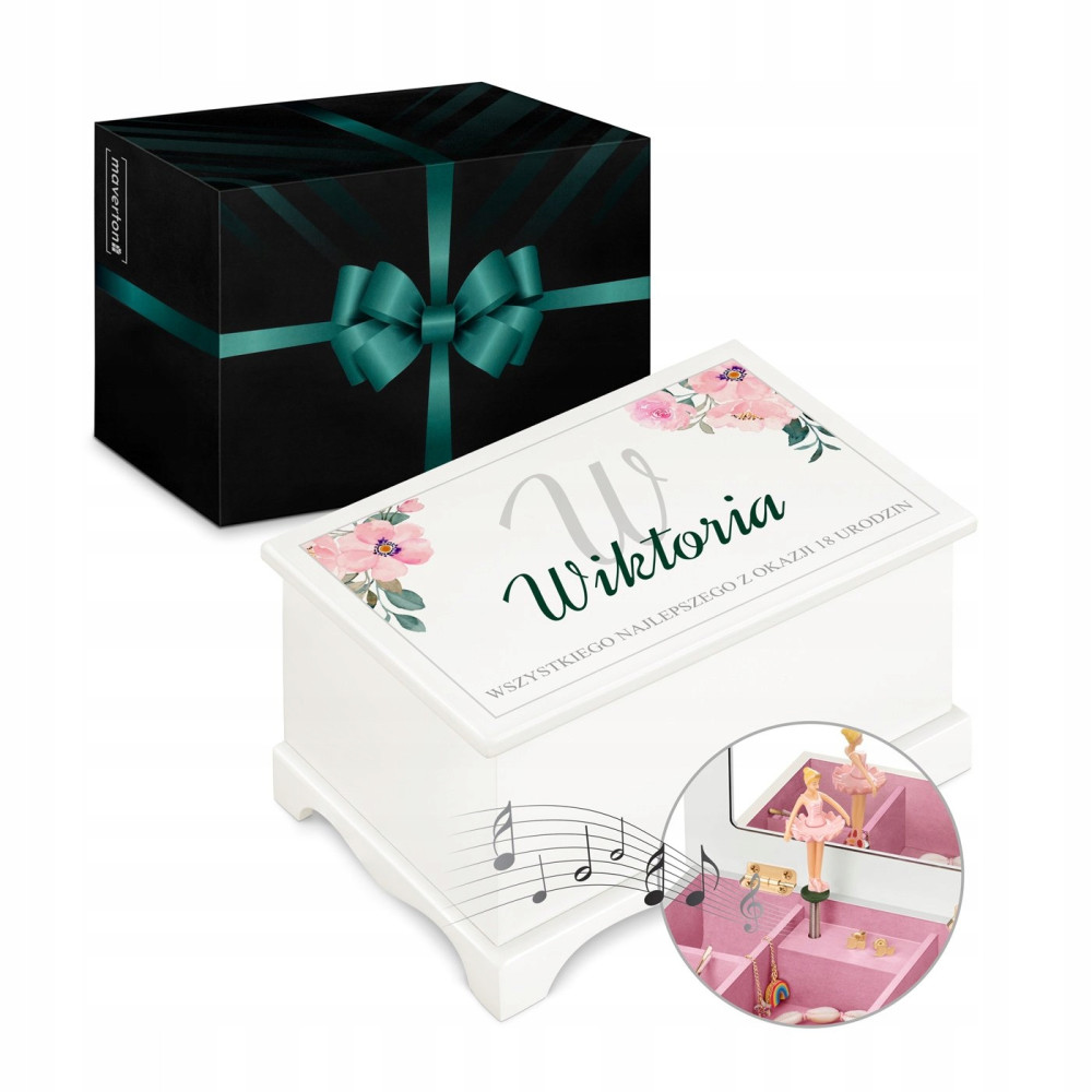 Nie wiesz, co kupić dla niej na wyjątkową okazję? Szukasz czegoś dla kogoś, kto posiada bogatą kolekcję biżuterii? Spersonalizowana drewniana szkatułka z nadrukiem i pozytywką to idealny upominek dla miłośniczki eleganckich i praktycznych dodatków wzbogacających wystrój wnętrza domu. Biała szkatułka zawiera 4 przegródki wypełnione miękkim, różowym welurem. Schować w niej można rodzinną biżuterię. czyli: kolczyki, naszyjniki, łańcuszki, bransoletki i pierścionki. Kuferek drewniany wzbogacony jest o pozytywkę, która wygrywa utwór "Dla Elizy". "Dla Elizy" to nieśmiertelna miniatura fortepianowa skomponowana przez Ludwiga van Beethovena. Utwór ten miał powstać ok. 1810 roku. Według jednej z hipotez jego adresatką miała być wielka miłość znanego na całym świecie artysty. Pozytywka posiada klasyczny mechanizm, który wymaga jedynie ręcznego nakręcenia, aby móc wsłuchiwać się w piękną i przepełnioną spokojem melodię. W trakcie grania utworu, mając w tle praktyczne lusterko, porusza się figurka baletnicy, obracając się niczym prawdziwa tancerka na scenie czy w trakcie ćwiczeń w szkole baletowej. Ten uroczy upominek będzie wspaniałym darem dla niezwykłej, wrażliwej damy, która ceni piękno. Wybierz projekt dedykacji i dopasuj nadruk, tworząc spersonalizowany prezent dla bliskiej kobiety na zbliżający się okazję. Gratis dodajemy opakowanie prezentowe z logo sklepu Murrano!