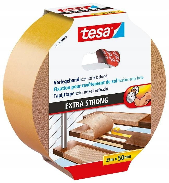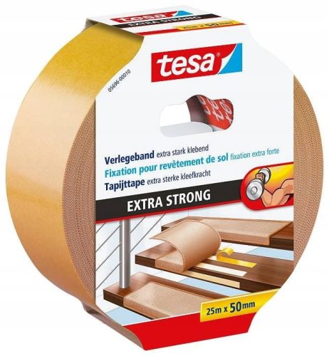 Dwustronna taśma do wykładzin tesa® bardzo mocna nadaje się do niezawodnego mocowania wykładzin wewnątrz i na zewnątrz pomieszczeń (pod zadaszeniem).