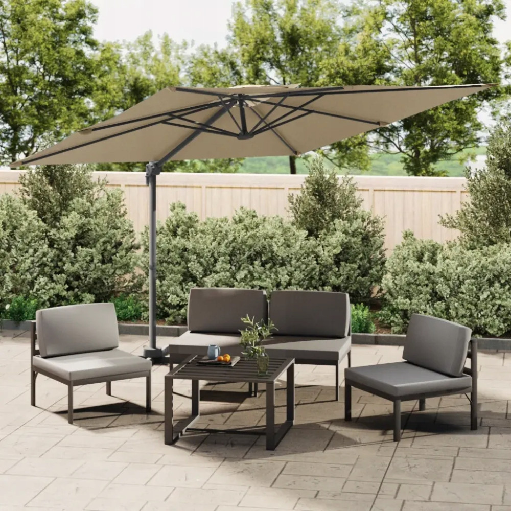 Ten elegancki parasol wiszący z podwójną czaszą będzie doskonałym wyborem, który zapewni nieco cienia i ochroni Cię przed szkodliwymi promieniami UV. Trwały materiał: poliester to materiał syntetyczny, znany ze swojej odporności na promienie UV oraz wytrzymałości na rozciąganie. Poliester z powłoką z PA jest wodoodporny, co czyni go idealnym wyborem na wilgotne lub deszczowe warunki. Można go także łatwo wyczyścić.Solidna konstrukcja: mocna rama z malowanego proszkowo aluminium oraz 15 wytrzymałych żeber sprawiają, że ten parasol słoneczny jest bardzo trwały i stabilny. Posiada on również solidną podstawę krzyżową, która zapewnia mu dodatkową stabilność.Pochylana i obrotowa o 360 stopni konstrukcja: ustaw pozycję zadaszenia za pomocą mechanizmu pochylania, aby zadbać o komfort na świeżym powietrzu przez cały dzień. Możesz również przekręcać parasol o 360 stopni w poziomie, naciskając na pedał i przekręcając słupek.Model z podwójną czaszą: podwójna czasza zapewnia wystarczającą wentylację, dzięki czemu parasol jest bardziej stabilny na wietrze oraz zapewnia przyjemny przewiew.System korbowy: mechanizm korbowy pozwala otwierać i zamykać parasol bez wysiłku. Uwaga:Ten produkt nie jest w 100% wodoodporny. Dlatego zalecamy zabezpieczenie go preparatem impregnującym, aby uzyskać lepszą odporność na wodę.Każdy produkt jest dostarczany wraz z instrukcją montażu dla ułatwienia tej czynności.