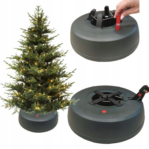 Solidny stojak pod żywą choinkę, ciężki ze zbiornikiem na wodę oraz wskaźnikiem poziomu wody (wskaźnik do działania nie wymaga baterii), dla choinki o maksymalnej wysokości 2,7m z automatycznym mechanizmem zamykania stojaka.