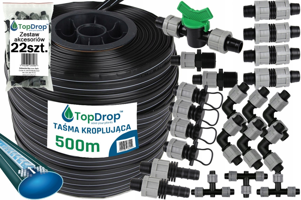 Komplet zawiera 22 sztuki akcesoriów do taśmy kroplującej.