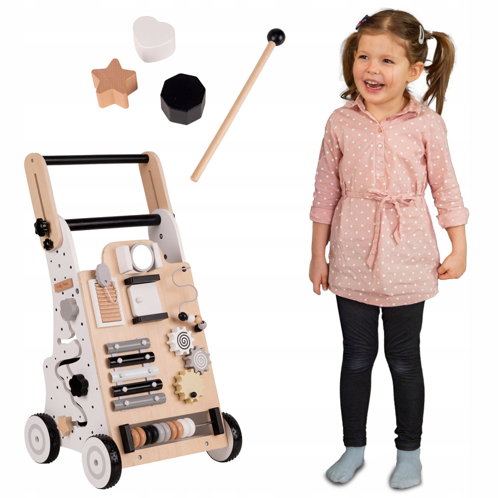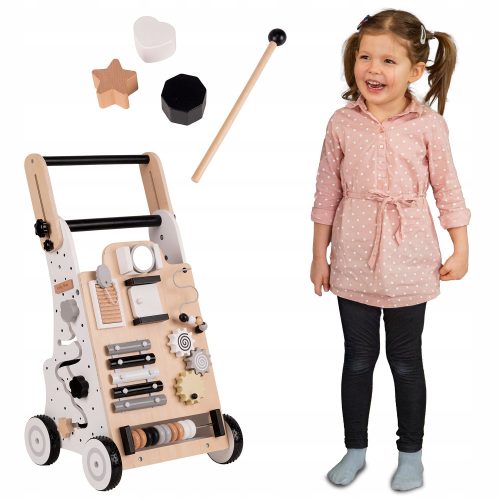 Solidny chodzik to nie tylko narzędzie pomocne przy nauce chodzenia, ale także interaktywne centrum zabaw, które wspiera rozwój umiejętności motorycznych dziecka. Każda ściana chodzika jest wyposażona w różne aktywności, co sprawia, że zabawa jest interesująca i rozbudza kreatywność malucha: