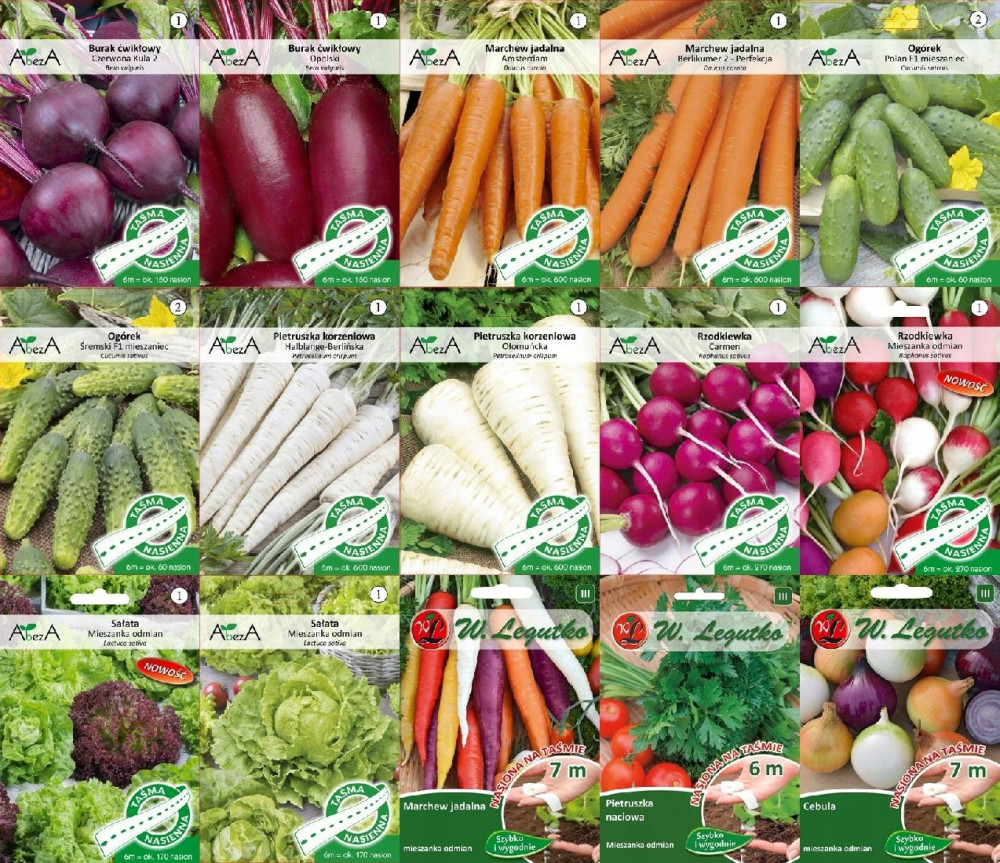 Zestaw ten zawiera 15 opakowań nasion na taśmie.