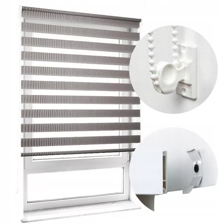 ➡️Ułożone kryjące i przezierne pasy dają efekt żaluzji; materiał nawinięty jest w pętli, co pozwala na zmianę położenia pasów tkaniny względem siebie i regulowanie dopływu światła
