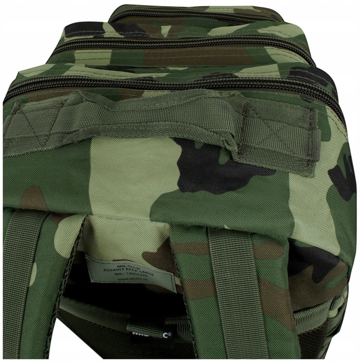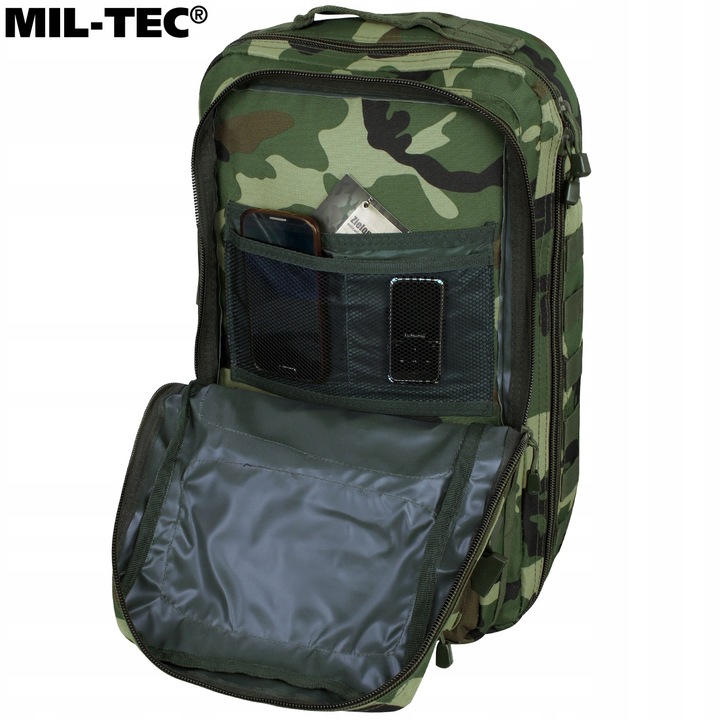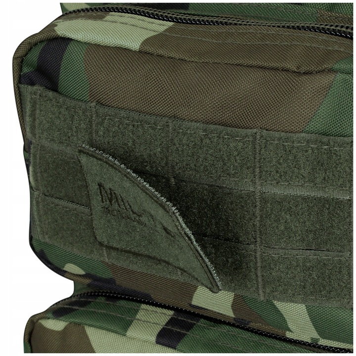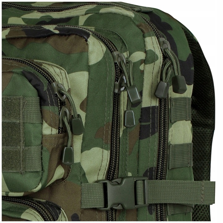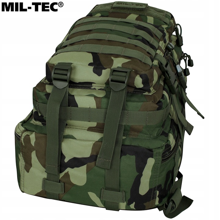 Na zewnątrz plecaka umieszczono taśmy kompatybilne z systemem MOLLE/PALS, zapewniając możliwość rozbudowy środka przez przytroczenie dodatkowych kieszeni lub zasobników. Boczne pasy kompresyjne, wyściełane regulowane szelki oraz kanały wentylacyjne gwarantują komfort i regulację pod ciężar przenoszonych przedmiotów. Plecak posiada również regulowany pas biodrowy dla lepszego rozłożenia ciężaru oraz uchwyt do przenoszenia w ręku.