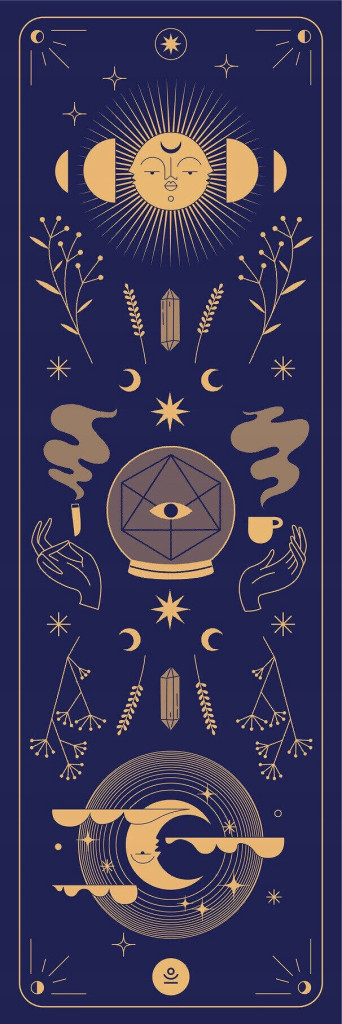Kauczukowa antypoślizgowa mata do jogi z mikrofibrą Magic pełna jest odniesień magicznych; mamy tu palo-santo, zioła, kwiaty i magiczne kryształy, a także takie atrybuty nowoczesnej czarodziejki jak magiczna kula, którą ułożyliśmy w centrum, wypełniona geometrycznym wzorem, przypominającym ryciny astrologiczne z poprzednich wieków. W centrum Trzecie Oko. Wzór jest inspirowany kartami Tarota - klimatyczny, ale jednocześnie niezobowiązujący i elegancki. Pięknie odnajdzie się w każdej przestrzeni jogowej.