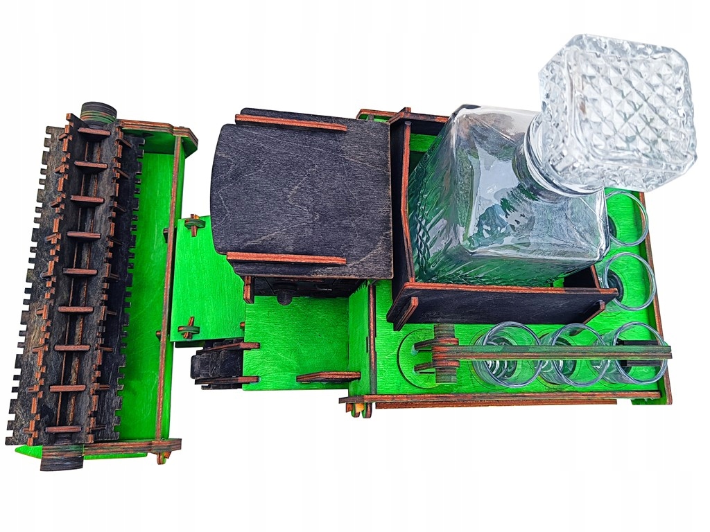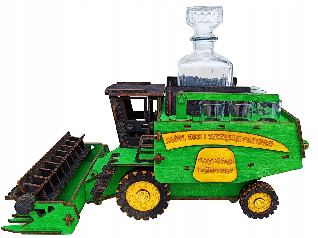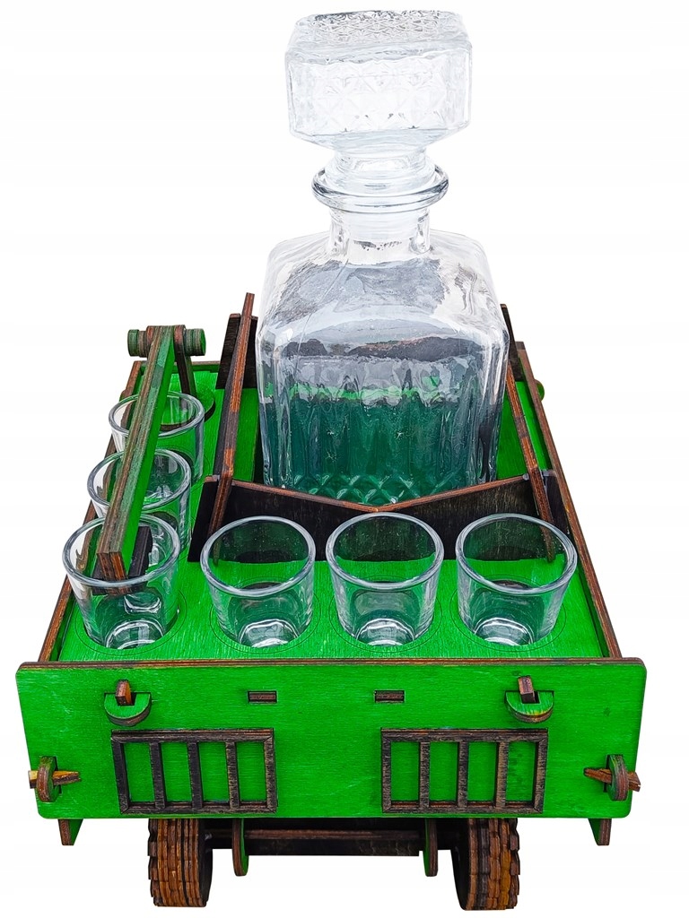 Kombajn dostępny w wersji ze szklaną karafką na alkohol (850 ml) i sześcioma kieliszkami do wódki.