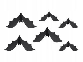 Papierowe dekoracje w kształcie nietoperza. Każda zawieszka jest w czarnym kolorze, oraz posiada linie zgięcia skrzydeł. W zestawie z taśmą dwustronną, dzięki czemu może być przymocowana do różnych powierzchni. Nietoperze są niezależne od siebie.