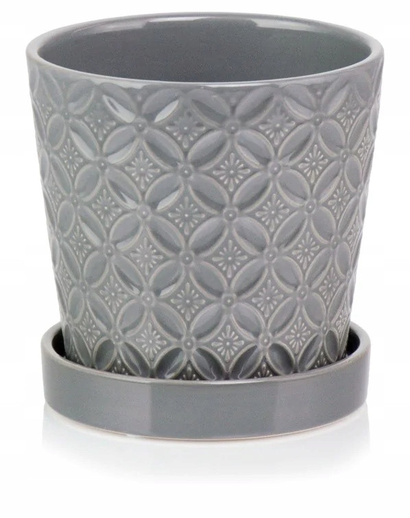 Doniczka szara z podstawkiem 15x15 cm w kolorze szarości z ozdobnym wzorem.