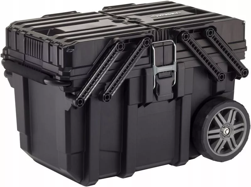 Skrzynka posiada wzmocnioną konstrukcje poprzez przetłoczenia. Równie mocny metalowy uchwyt oraz zatrzaski. Wytrzymały system wspornikowy zapewniający szybki i łatwy dostęp do wszystkiego, czego potrzebujesz.