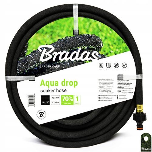 AQUA-DROP - SOAKER HOSE - elastyczny i odporny, wykonany w 100% z przetworzonej gumy wysokiej jakości, dzięki czemu równomiernie przepuszcza wodę na całej długości.