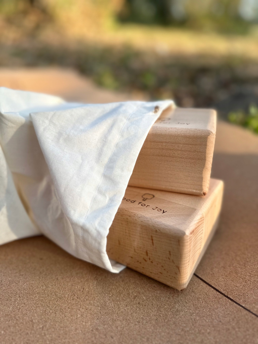 Każdy komplet klocków jest otulony w woreczek z bawełny z logiem wood for joy.