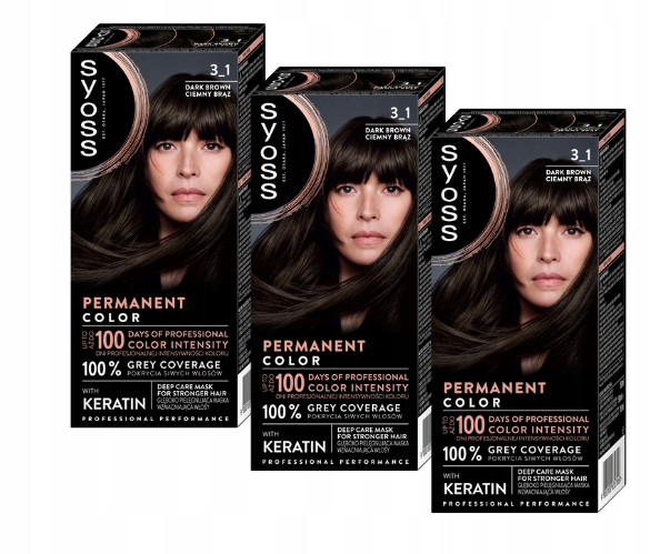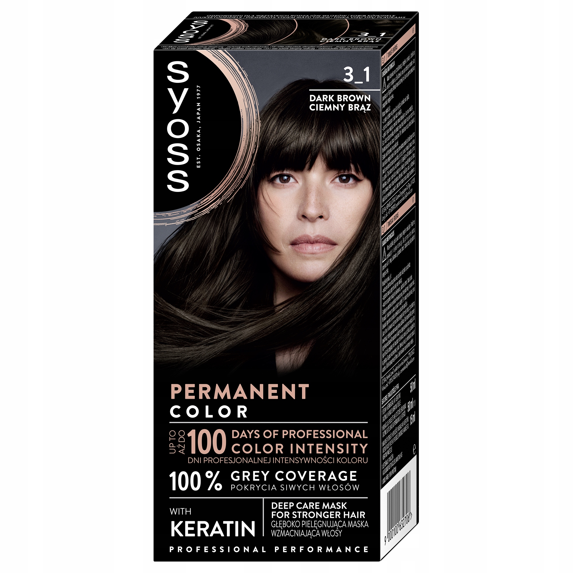 Farba do włosów Syoss 3_1 Ciemny brąz jest zalecana do włosów od średniego brązu do ciemnego brązu, czerni. W przypadku włosów średniej długości lub długich należy użyć 2 opakowań.