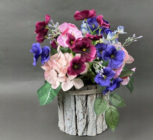 „Szepty ciszy…” to subtelna, elegancka i pełna uroku kompozycja kwiatowa stworzona z myślą o godnym upamiętnieniu bliskich. Delikatne bratki oraz okazałe hortensje wykonane zostały z najwyższej jakości materiałów tekstylnych, do złudzenia przypominając naturalne kwiaty zarówno pod względem kolorystyki, jak i faktury.