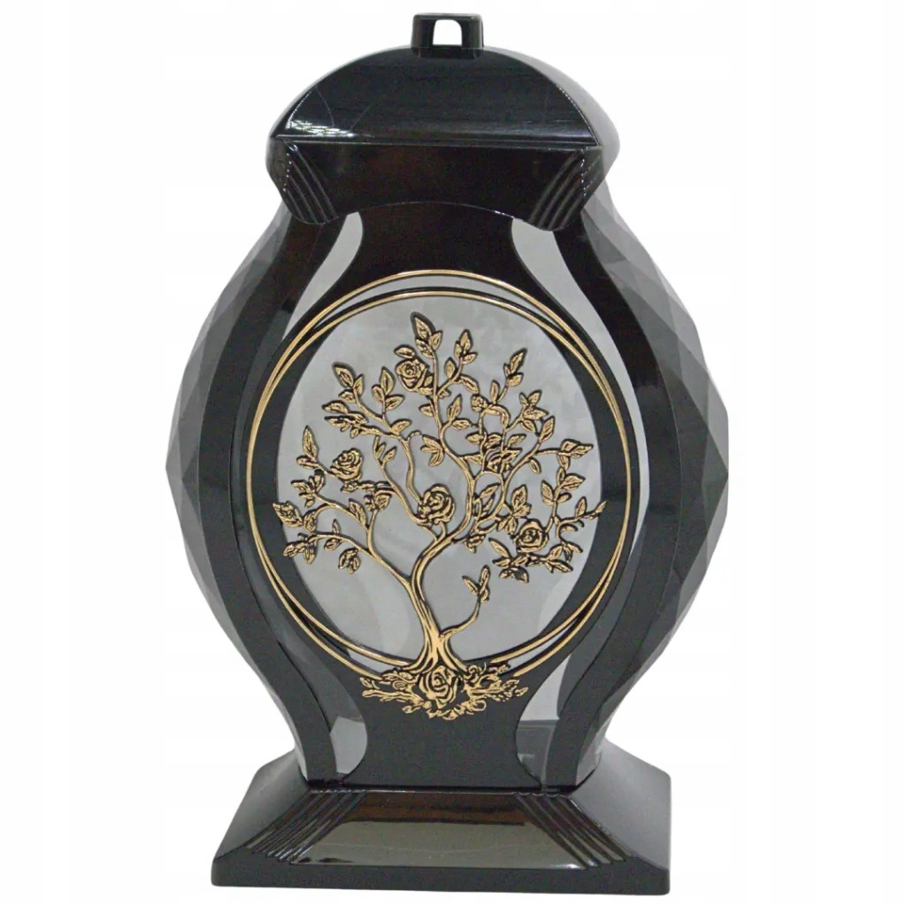 Duży, dekoracyjny znicz nagrobny o unikalnym kształcie wazy z pięknym złotym motywem drzewa. Wykonany z połączenia szkła i tworzywa sztucznego. Lustro umieszczone na spodzie potęguje efekt świetlny, a złote zdobienie nadaje całości szlachetnego i eleganckiego charakteru.