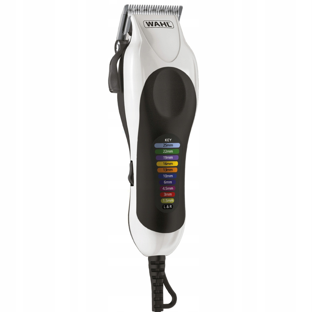 Maszynka do strzyżenia WAHL Color Pro 20104-0460 to zasilane sieciowo urządzenie, które dzięki wydajnemu silnikowi PowerDrive zapewnia niezawodną pracę. Szerokość nożyka wynosi 4,6 cm, a długość strzyżenia można regulować w zakresie od 1 mm do 2,5 cm za pomocą 10 dołączonych nasadek. Ergonomiczna konstrukcja ułatwia użytkowanie. W zestawie znajduje się bogaty pakiet akcesoriów, w tym nożyczki, grzebień do stylizacji, szczoteczka do czyszczenia, olej oraz etui.