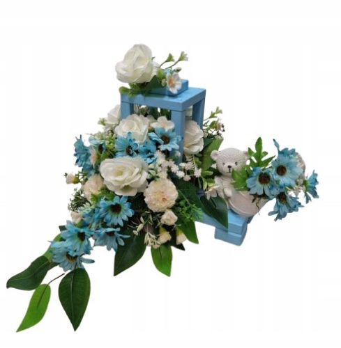 Stroik nagrobny dziecięcy w drewnianym lampionie z betonową figurką w kształcie misia z beczką wypełnioną kwiatami. Wersja niebieska