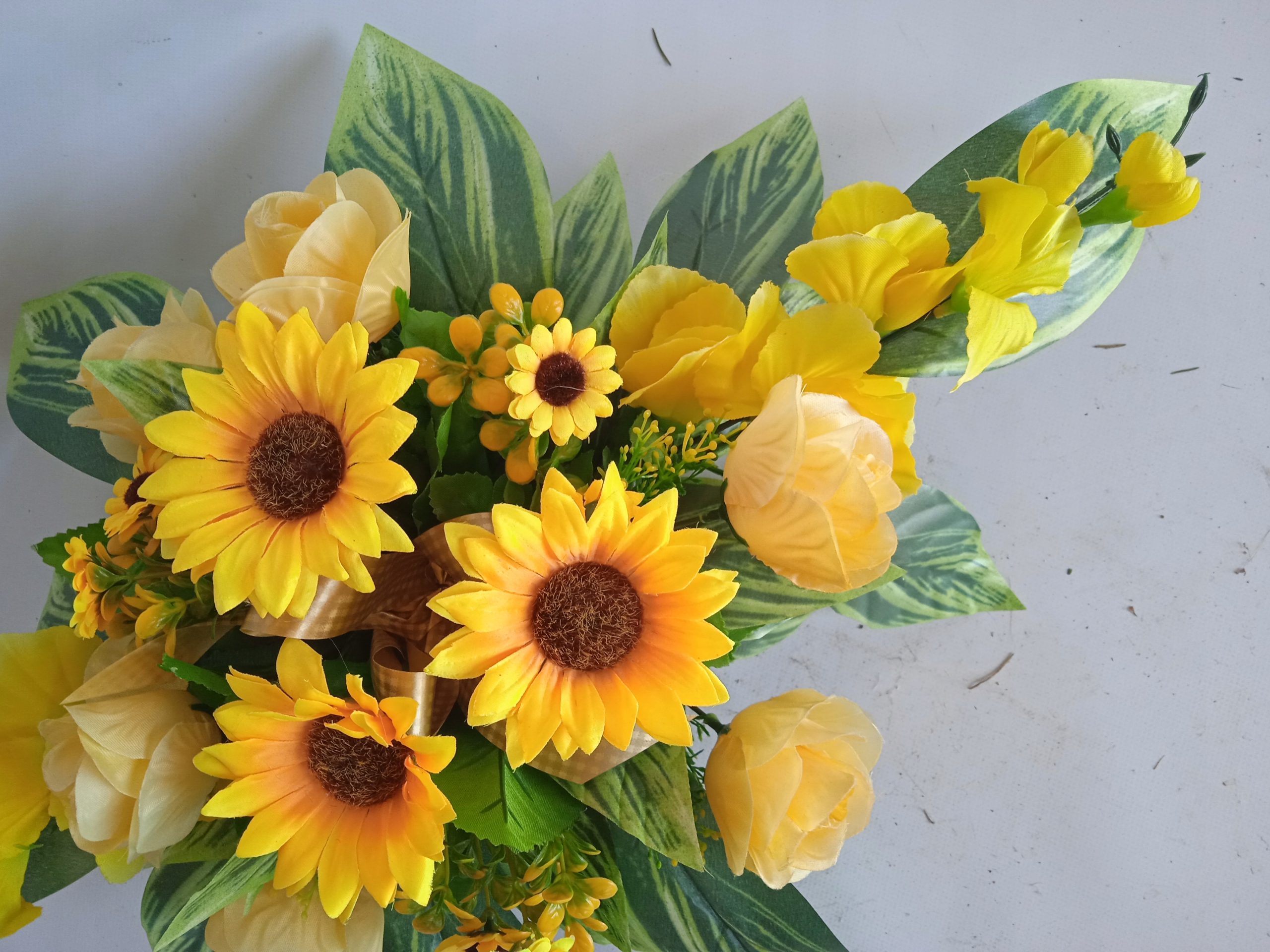 KOMPOZYCJA wykonana w DONICZCE obciążonej betonem z sztucznych kwiatów i dodatków - jak widać na zdjęciach.