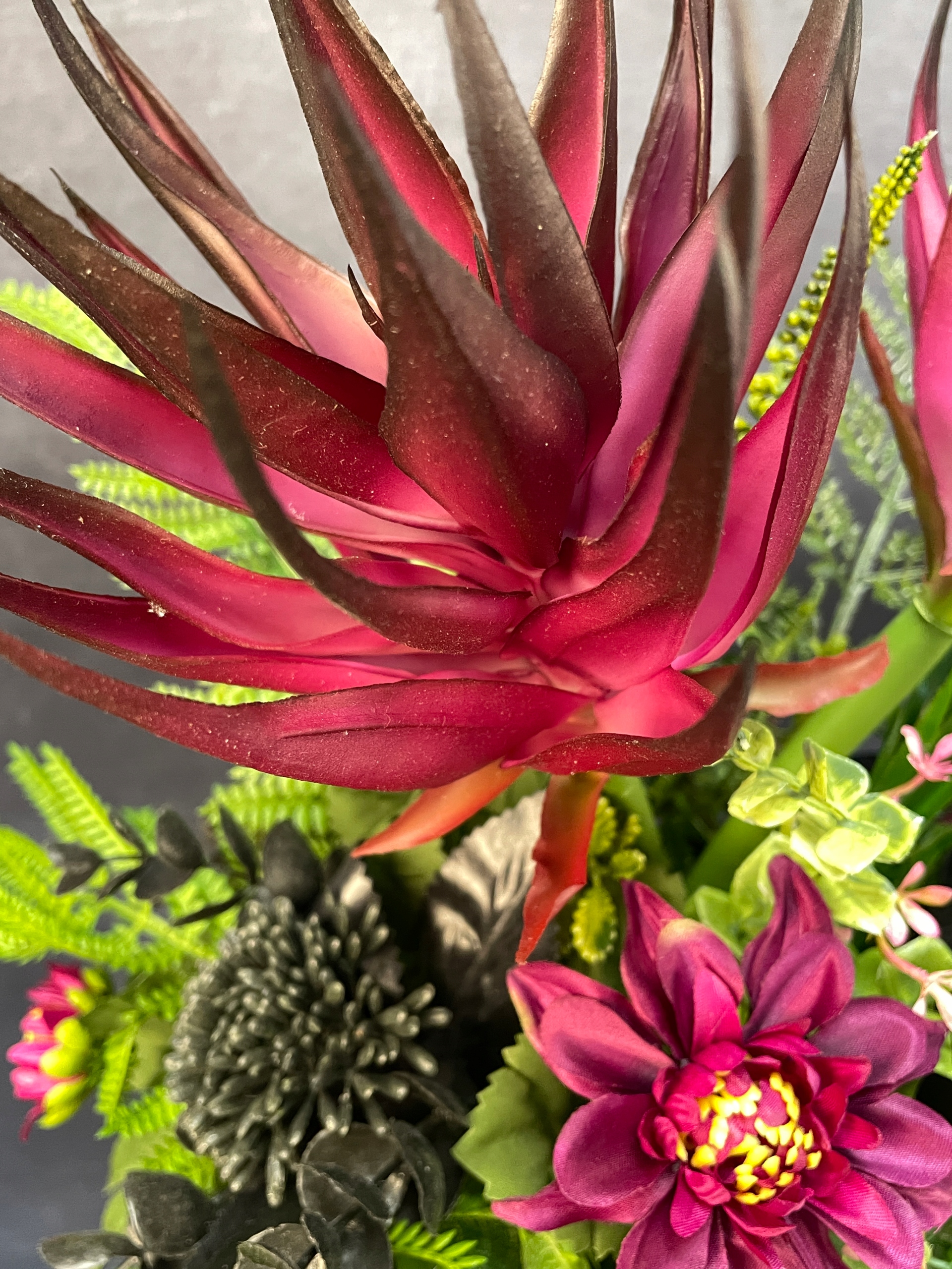 Główną częścią zestawu jest elegancka kompozycja kwiatowa osadzona w solidnej, ciężkiej donicy, która została dodatkowo obciążona, aby zapewnić stabilność nawet przy trudniejszych warunkach pogodowych. Aranżacja składa się z burgundowych i bordowych róż, czarnych róż, kwiatów w odcieniach fuksji oraz dekoracyjnych liści paproci i innych zielonych dodatków, które nadają całości lekkości i świeżości. Charakterystycznym elementem są oryginalne, strzeliste kwiaty w intensywnym bordowym kolorze, które dodają kompozycji wyrazistości i elegancji.