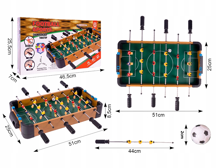 W rozgrywce muszą brać udział co najmniej 2 osoby. Każda z drużyn ma do swojej dyspozycji 9 graczy. Piłkarze umieszczeni są na metalowych prętach jak w klasycznym stole od gry.